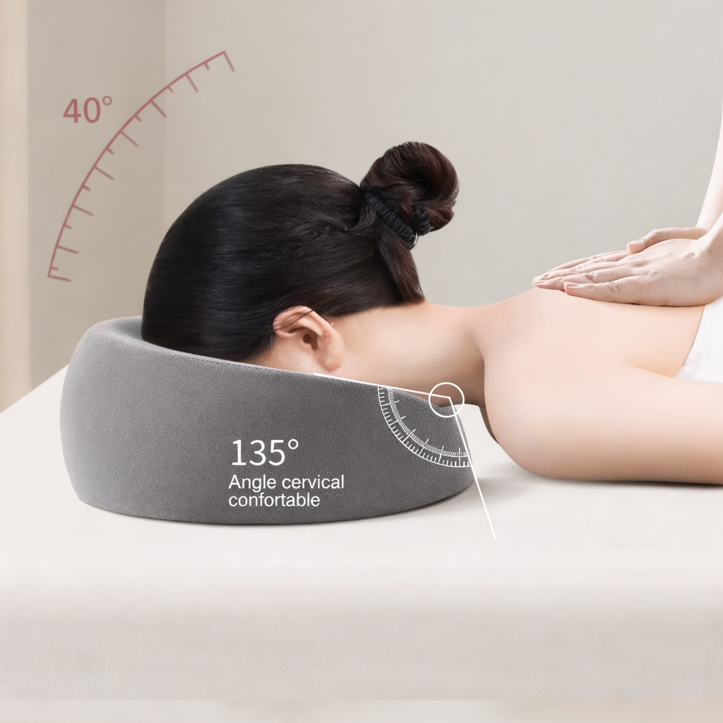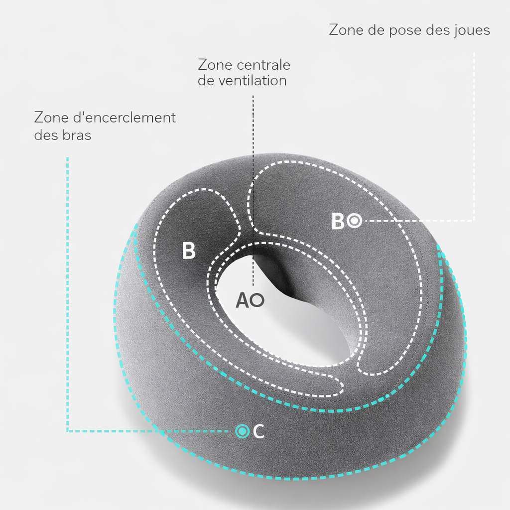 Sa forme circulaire avec ouverture centrale permet de libérer l’espace au niveau du visage tout en maintenant un appui stable autour de la tête. Cette conception favorise une sensation de légèreté et limite les points de pression, pour un moment de détente plus agréable, de jour comme de nuit.